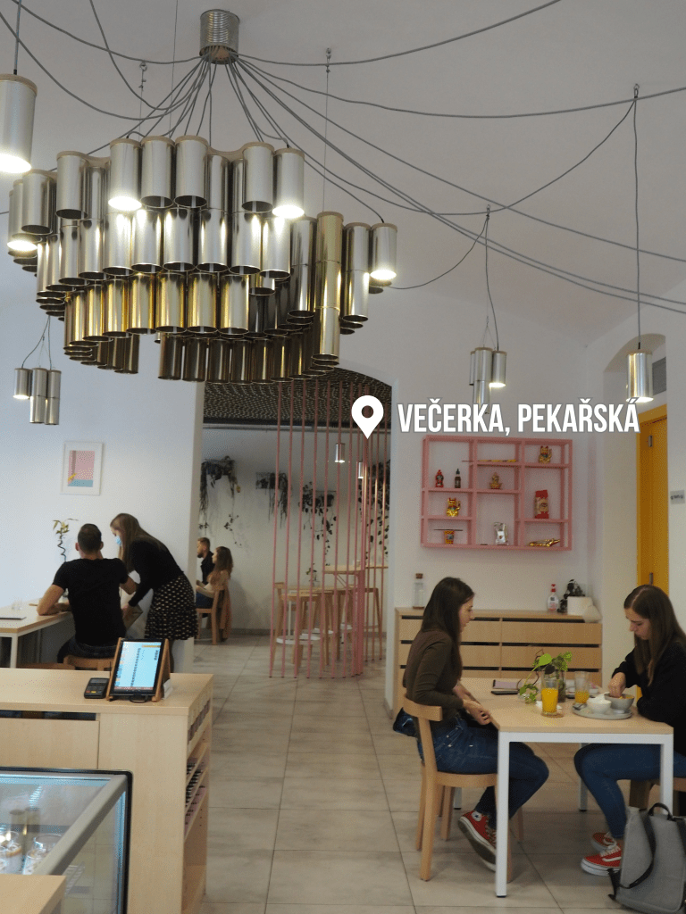 Večerka je kavárna, která dělá mimikry jak svým názvem, tak velmi nenápadným vývěsním štítem kousek od zastávky Šilingrovo náměstí. Interiér je sice minimalistický, ale velmi svěží a vtipný. Mají tu výbornou kávu, ale dělají i skvělé originální snídaně. Jediná nevýhoda je, že až od 9 hodin, takže nic pro ranní ptáčata, která chtějí být brzy v práci.