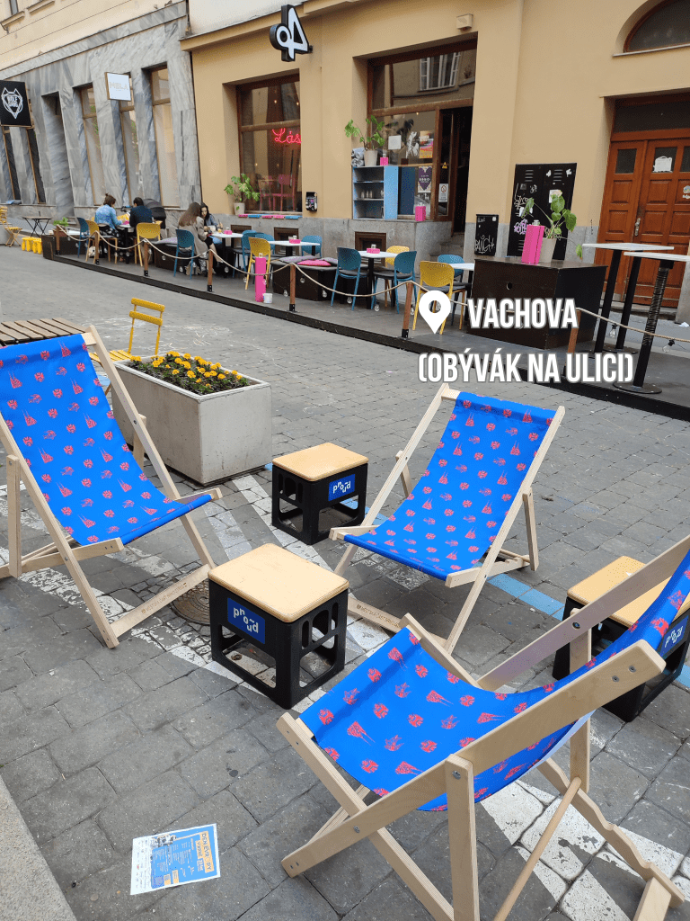Ulice Vachova se stala svého druhu sociálních experimentem. Zrušila se zde parkovací místa, zakázal vjezd a namísto toho tady vznikl prostor pro nekomerční posezení, které doplňuje zahrádky místních gastro podniků. Začalo se tady tomu přezdívat obývák na ulici. Posedět můžete jen tak, nebo využít vynikajících drinků ve 4 Pokojích či bezkonkurenční pizzy v Zaze.