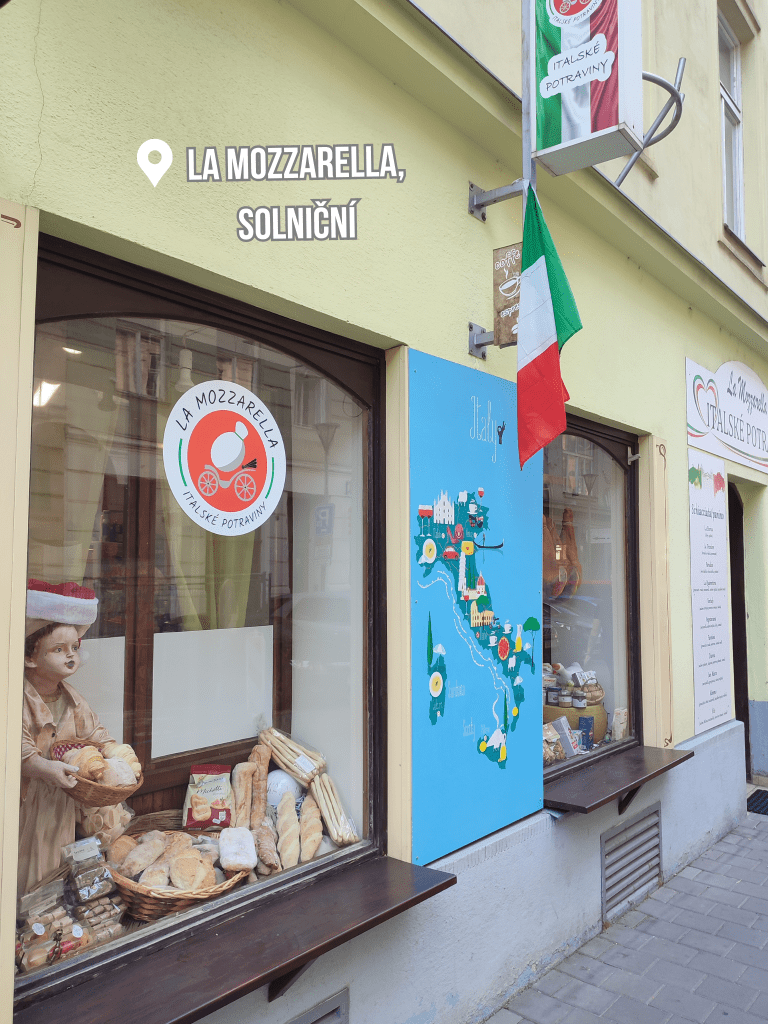 Obchůdek La Mozzarella je jeden ze zástupců italských potravin v Brně. Přímo v centru, na Solniční ulici, můžete zaplout do tohoto malého krámku, kde si vyberete z italských těstovin, oliv, uzenin, sýrů a také výborného pečiva. Až vás možná překvapí, kolik pochutin se do tak malého prostoru vejde.
