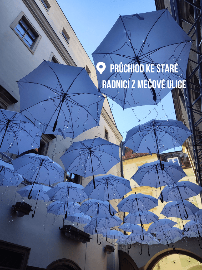 Další novinkou pro rok 2024 je ulička ke staré radnici. Zatímco pod radnicí již tradičně číhá drak ve svítícím svetru, na opačnou stranu do ulice Mečové se můžete vydat po červeném koberci a pod instalací svítících deštníků.