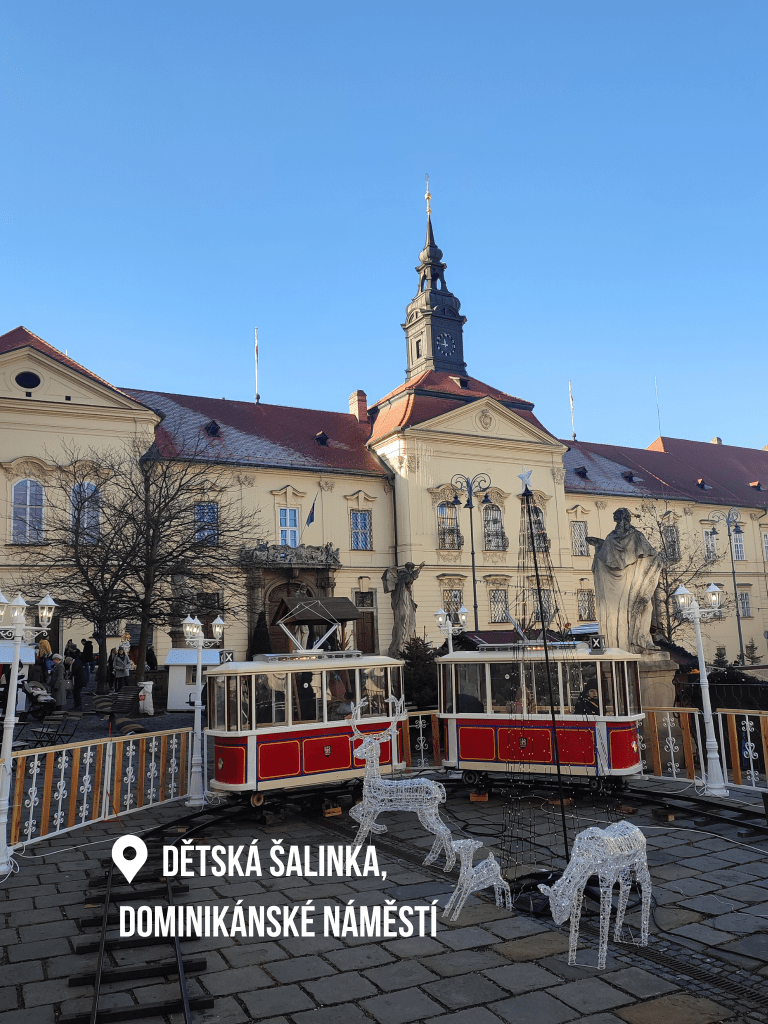 Nejvíc atrakcí najdou děti na Dominikánském náměstí. Mezi nimi například tento vláček, respektive mini šalinku. Jedna jízda stojí 60 Kč (kartou to neprojde).