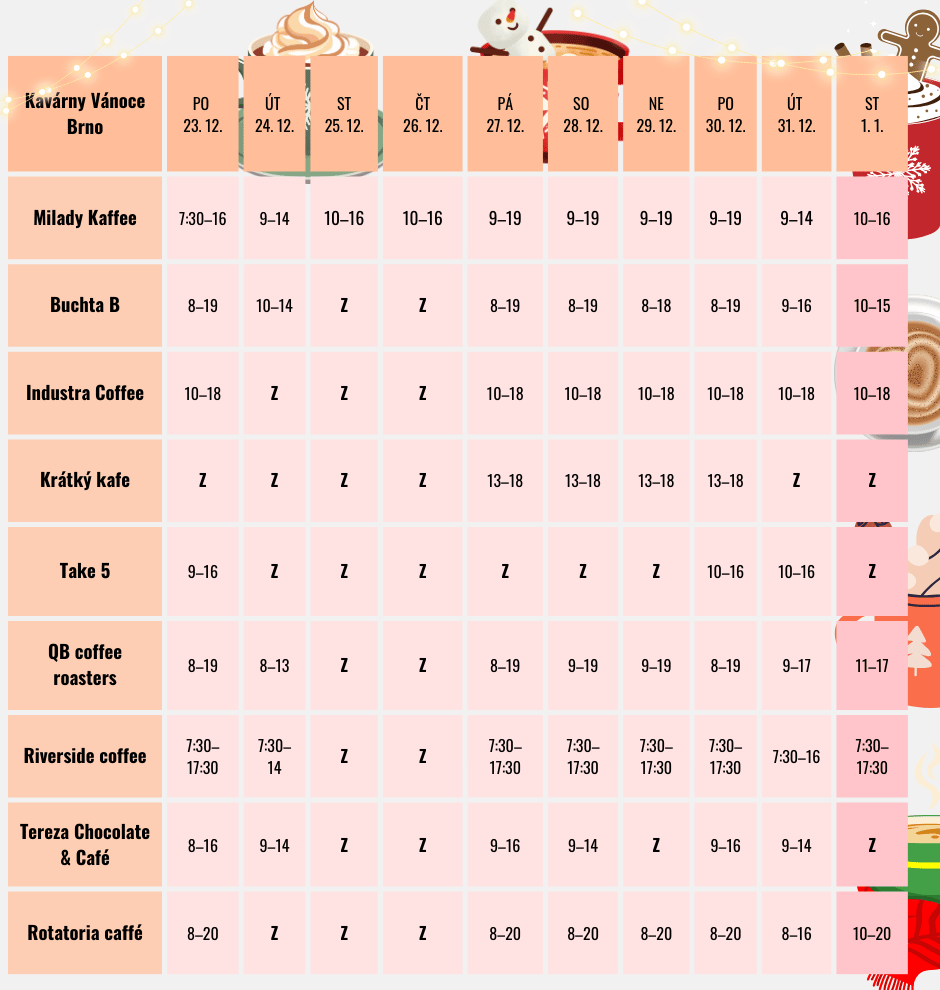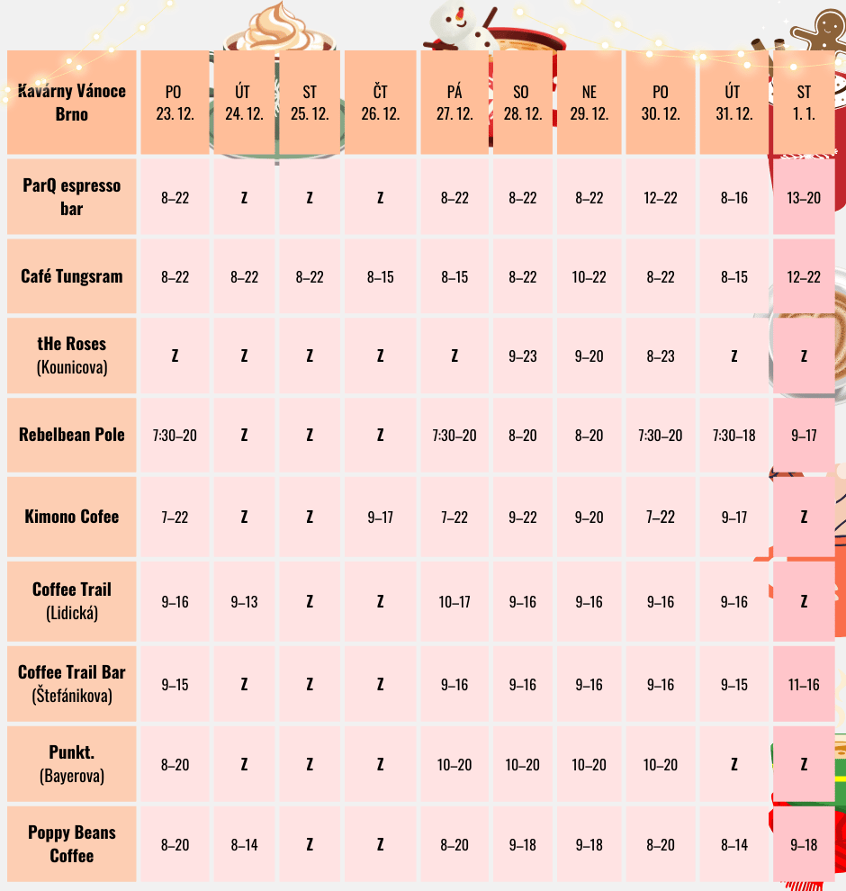 A ono není zas tak jednoduché v závěrečných dvou týdnech roku správně odhadnout, který podnik má otevřeno a kdy. Je potřeba skenovat cíleně sociální sítě, webovky…i tak to někteří mají nalepené jen postaru na dveřích. Přináším tedy přehled oblíbených kaváren v Brně, kde dostanete fajn kafe a současně mají otevřeno aspoň některý den od 23. 12. 2024 do 1. 1. 2025.