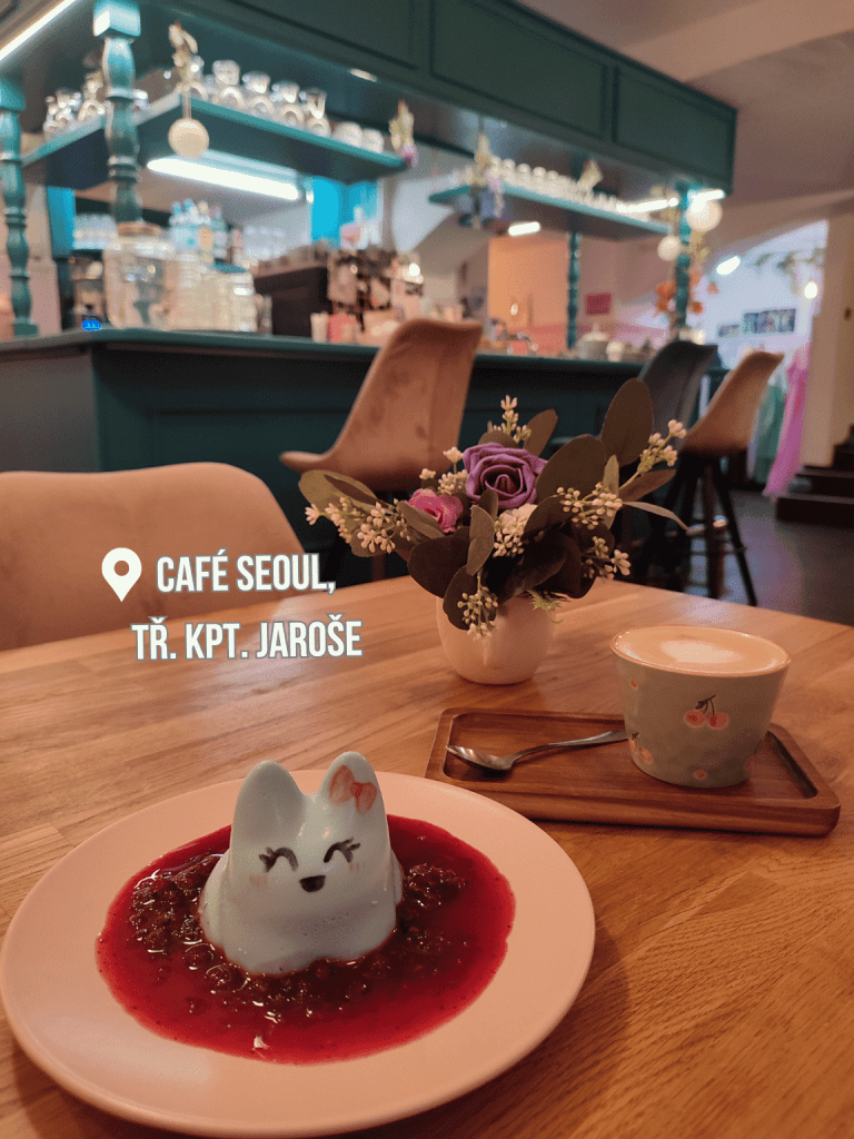 Specifickým podnikem je Café Seoul, které otevřelo na konci léta 2024. Majitelka – nadšenkyně do korejské kultury propůjčila korejský duch i své nové kavárně. Káva je tu však k dispozici zcela konvenční (což my kávomilci oceňujeme 🙂 ). Specialitou jsou pudinkové kočičky, jen jsou za mě bohužel spíš víc na efekt, než k jídlu, protože hmota, ze které jsou vytvořeny, postrádá jakoukoliv chuť. Rozhodně však jde o zajímavý počin na našlapané Jarošce, tak budeme přát, ať nám tam tento podnik nějaký pátek vydrží.
