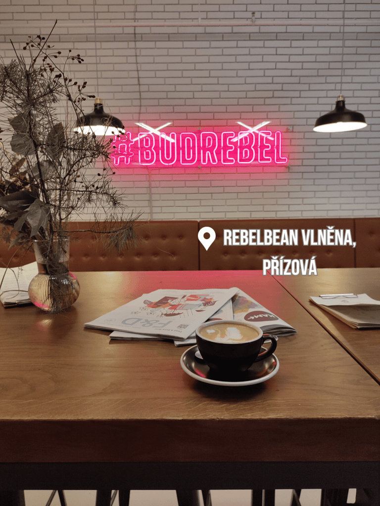 Rebelbean Vlněna v novém komplexu na Přízové ulici byla jedna z prvních kaváren v Brně, která zavedla objednávky na baru, což přijde všem kavárenským pracantům vhod – jednoduše si tu objednáte, co chcete a během práce už vás nevyrušuje personál, který by číhal na nové objednávky, jakmile dopijete své kafe nebo limču. Coffee office vyhovují také příčkami oddělené boxy s lavicemi, centrální části kavárny pak dominuje velký coworkingový stůl s barovými židličkami.
