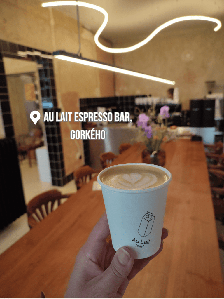 Au Lait espresso bar přinesl vynikající kávu do oblasti Úvozu. Najdete ho na Gorkého vedle legendární hospody Bláhovka. Posezení je tu udělané podobně jako v Monogramu, tedy velký centrální stůl + možnosti sedět v okně.