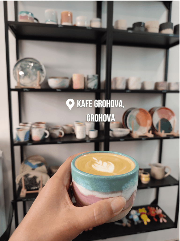 Kousek od zastávky Grohova najdete nový espresso bar Kafe Grohova, který je sesterským podnikem vedlejší keramické dílny. Což poznáte hned, výrobky z keramické dílny tu zdobí všechny police (a můžete si je samozřejmě koupit).