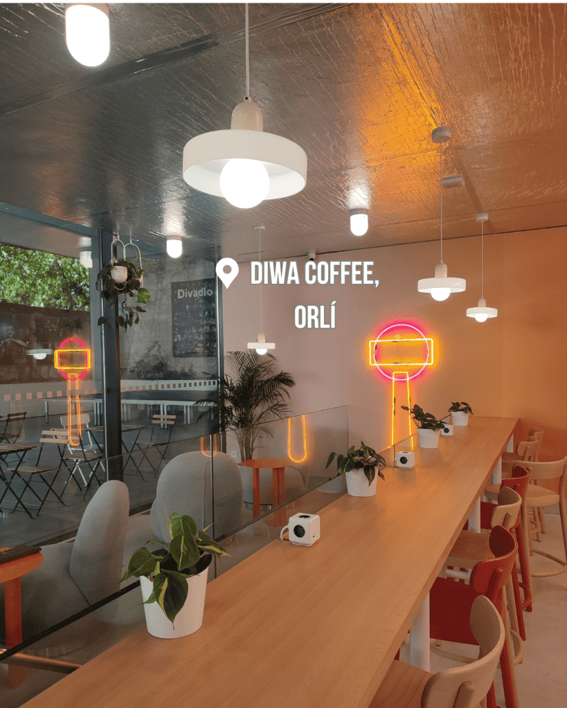 Hned 1. září vtrhla na scénu rozverná Diwa coffee. Nová kavárna zaplnila prostor vedle studentského divadla JAMU na Orlí ulici. Je to tu barevné, svěží a trochu drzé. Je jasné, že cílovkou jsou zejména studenti a pracanti (je tu dlouhý cowork stůl se zásobou zásuvek na notebook). Vedle skvělé kávy tu mají fakt výborné dezerty od Fluff Brno.