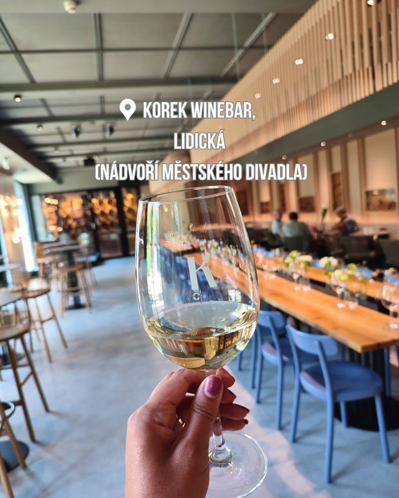 Korek winebar je velmi prostorný vinný bar na nádvoří Městského divadla, takže se nabízí spojit zde kulturu s nějakým vinným osvěžením. Funguje to tu jako enotéka jihomoravských vín: vezmete si kartičku a pak si tu skleničku plníte jednotlivým vzorky dle své chuti a načítá se vám útrata.