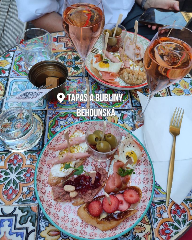 Tapas a bubliny jsou přesně to, co říká jejich název. Ideální podnik na léto. Hýři barvami, chutěmi a vůněmi. Víno se tu výborně doplňuje s jedinečnou nabídkou malých tapas (nabíráte si je v rámci volného výběru a následne si přepočítáte zapichovátkaú. Jestli se chcete aspoň mentálně přenést na slunný jih, jsou Tapas a bubliny kousek od Jakubského náměstí jasná volba.